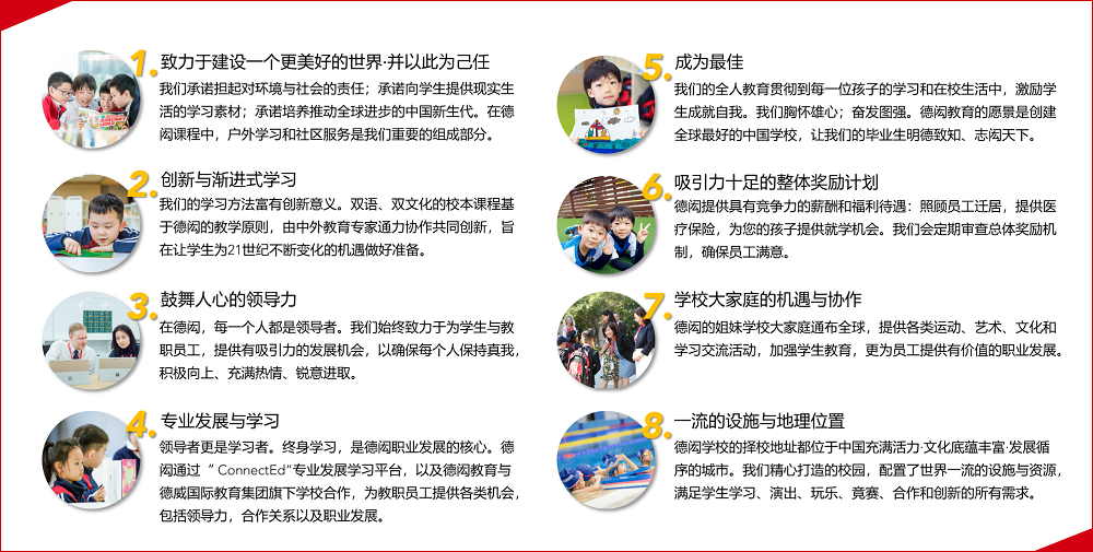 德闳学校在向学生提供优质教育的同时,同样认识到卓越而富有激情的职业人是最宝贵的资源。德闳学校的教育者对学生的教育事业怀有宏大志向,一切以学生为先。他们为学生的课内外成就与发展设立最高标准,积极践行德闳学校的愿景与使命,全身心投入学校生活, 热忱地帮助与支持学生、同事及家长。