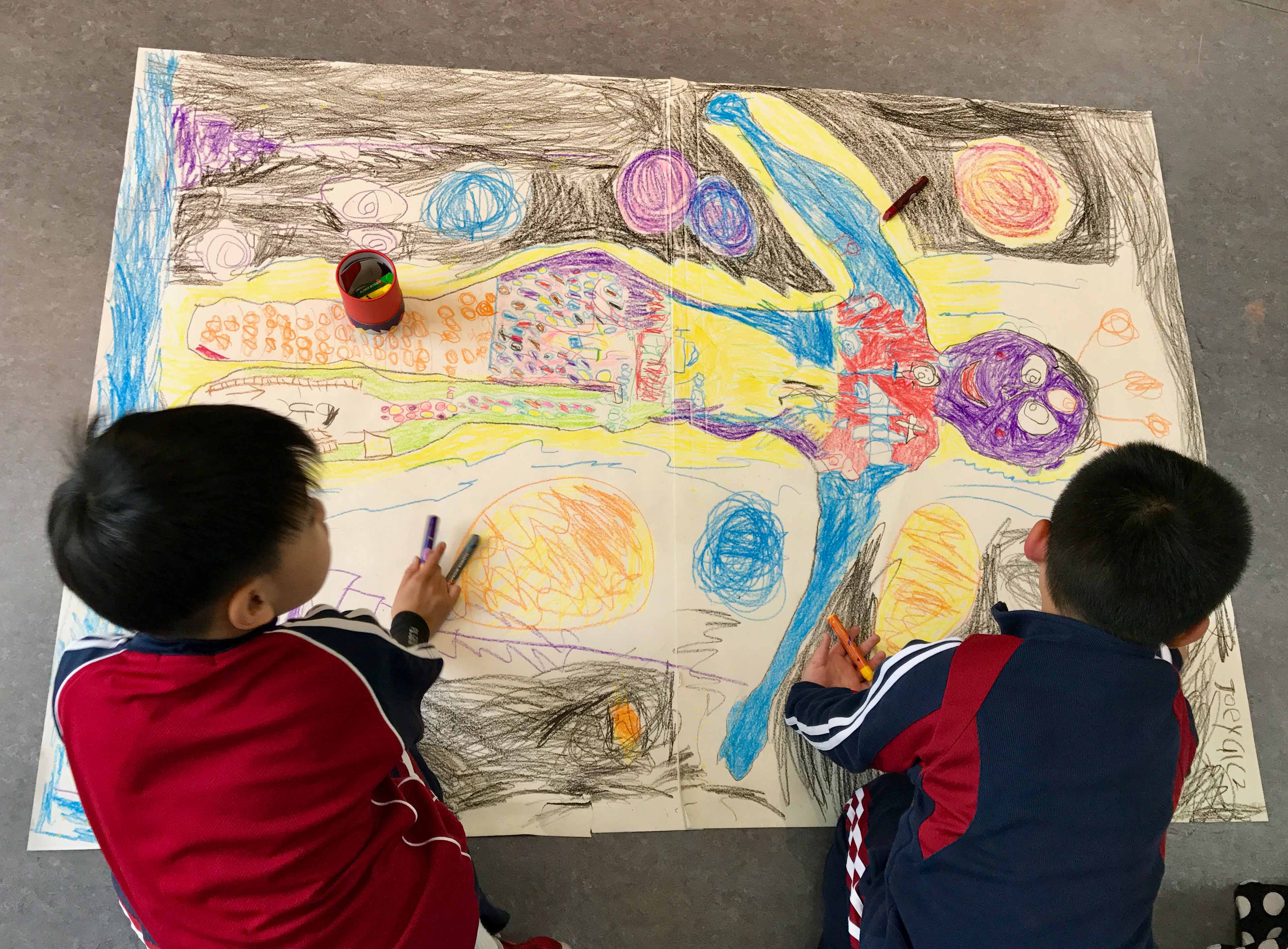 为期四天的艺术节上,一年级到三年级的学生在一张人形大小的纸上,展开四肢,在另一个学生的帮助下,画出人形轮廓,然后用自己喜欢的颜色和图形在纸上作画,把自己的爱好和兴趣都画上。而四年级到七年级的学生,以四人为一组制作羽翼。天使般的羽翼象征每个孩子都是地球上的天使,单纯美好、充满希望。