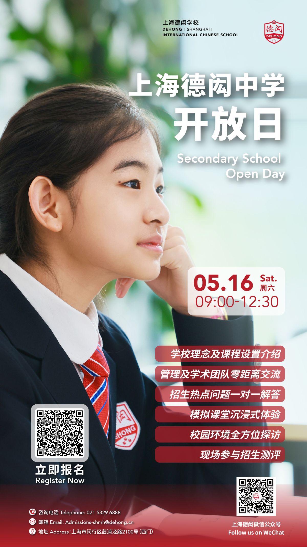 欢迎有意向申请小学、中学插班及初升高的家庭把握本学年最终机会,扫码报名,带娃来德闳校园寻找国际化教育择校路上的终极答案!