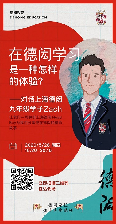 5月28日(本周四)19:30 - 20:15 本期德闳家长线上讲座我们邀请到了上海德闳学校九年级学子Zach,聆听他为我们分享在德闳学习和生活的精彩点滴!