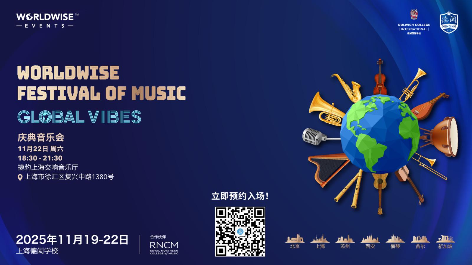 德闳德威大家庭屹珈国际教育集团(Education in Motion,简称EiM)年度最受瞩目的盛事之一——智胜全球音乐节(Worldwise Festival of Music,简称WFM)将于上海德闳盛大启幕!这是上海德闳首次作为东道主,举办如此规模的智胜全球活动!11月19日至22日,我们已邀请来自全球11所德闳德威大家庭姐妹校及英国北方皇家音乐学院(RNCM)的约250名师生齐聚上海,来到德闳,共同开启一场璀璨的环球音乐之旅。